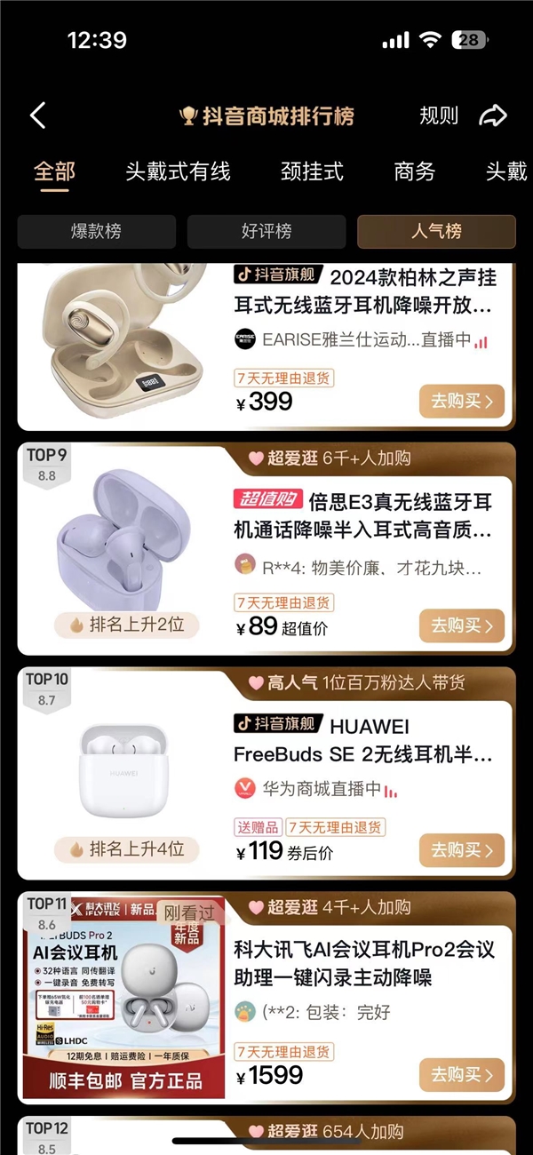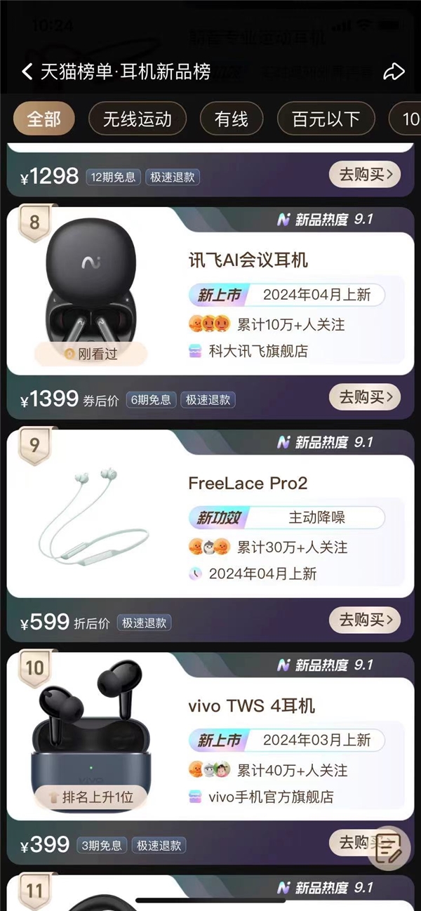新一代讯飞会议耳机Pro 2和iFLYBUDS 2等新品于5月15日正式首销后,迅速成为爆款产品。首销当日,就迅速登录京东、天猫、抖音三大电商平台热销排行榜,“蓝牙耳机”类目中,在天猫平台单品排名第一,京东平台单品排名第四,抖音平台进入排行榜第一梯队,销售额相比上一代产品Pro增长超1倍。首销一周,讯飞会议耳机Pro 2仍旧保持了相关排行榜前列,销售额相比上一代产品Pro增长超2倍,再创品牌新纪录,也展现了AI会议耳机的强大魅力。