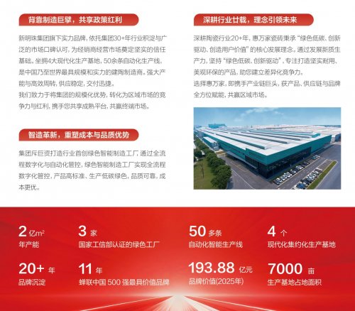 惠万家瓷砖依托新明珠集团雄厚实力,创新推出区域运营商合作模式,为寻求突破的经销商提供全新解决方案。