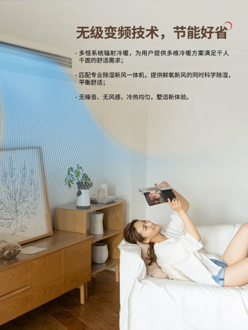 当室内温度接近设定值时,系统会自动降低输出功率,以最小能耗维持温度稳定,避免传统变频空调“阶梯式调节”带来的温度波动;而在应对换季期的突发闷热或潮湿时,又能快速提升功率,实现高效降温除湿。这种“按需输出”的运行模式,让室内温度变化曲线更平滑,体感舒适度显著提升,同时最大限度减少能源消耗,真正实现“舒适不打折,节能有实效”。