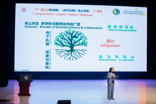 这句话正体现了马校长在今年朝阳凯文开学典礼上提出的“T型人才”培养理念:一竖,代表学术严谨与深度学习,是学生的学术基础培养;一横,象征跨学科协作和创新精神,是学生人生广度的拓展。二者交织,就是未来需要的复合型人才。