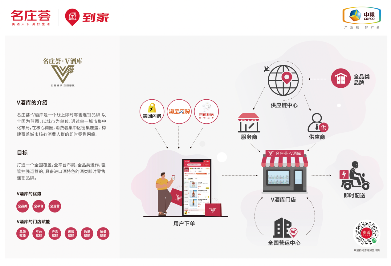 本次展会中,中粮名庄荟推出的“名庄荟·V酒库”即时零售模式,成为其在本届糖酒会上的重要亮点。该模式通过“城市级密集布局”策略,在线下核心商圈设立体验店,解决消费者“看不见、摸不着”的线上购酒顾虑;在线上则全面接入美团闪购、京东秒送、淘宝闪购等主流即时零售平台,实现“线上选酒—线下体验—分钟级送达”的全链路服务。