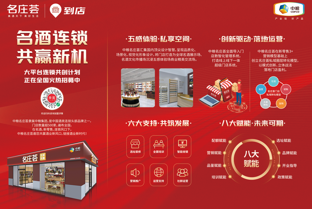 在连锁加盟方面,中粮名庄荟还面向全国发布了“大平台连锁共创计划”, 这一举措被业内视为对酒类连锁行业“重招商轻运营”现象的重要回应。“大平台连锁共创计划”提出“六大支持”与“八大赋能”体系,全面升级对加盟商的服务深度。其中,“六大支持”覆盖选址、装修、开业筹备等从0到1的关键环节,而“八大赋能”则聚焦门店持续经营与盈利提升,涵盖配额资源、营销活动、数智化工具等核心模块。致力于帮助加盟商提升本地化运营与用户服务能力,强化对加盟商的系统性扶持,提升门店持续盈利能力。
